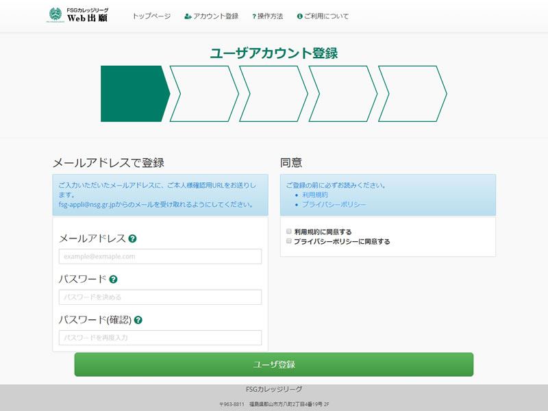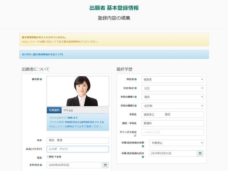 ご登録いただいたメールアドレスには、提出内容受理の通知、提出内容の受付や差戻し、AO入試面談日などのご案内などが送信されますので、必ず登録をお願いいたします。