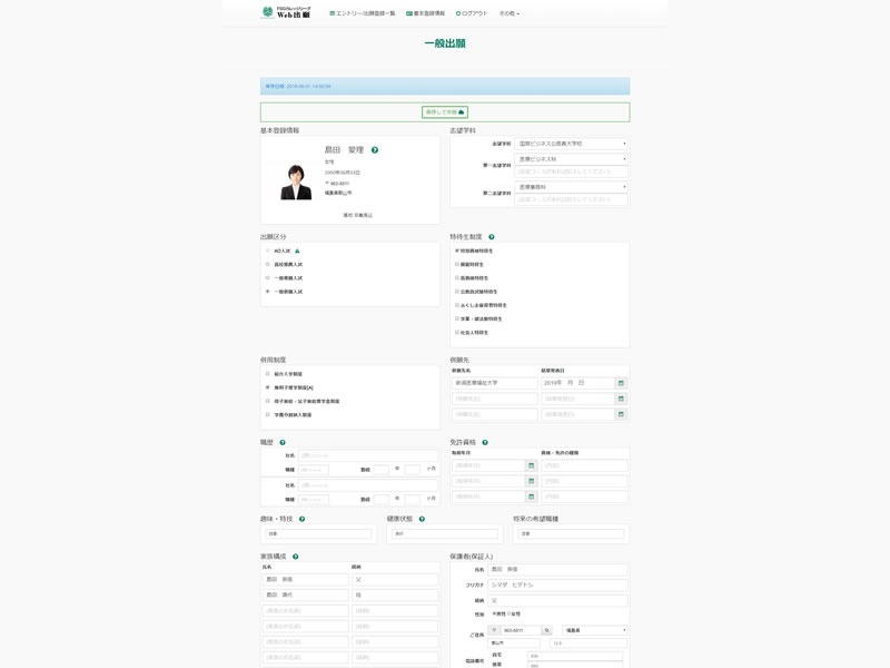 Web出願・WebAOエントリー(DEMO)システムからは、AO入試・高校推薦入試・一般入試(専願・併願)・社会人入試といった全ての入試制度に出願で利用できます。出願期間中はスマートフォンやPC、タブレットからいつでも出願登録でき、入力も画面表示に従ってスムーズにできます。自動でエラーチェックをしますので記入漏れがなく、途中保存や修正も簡単です。